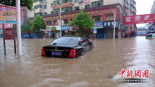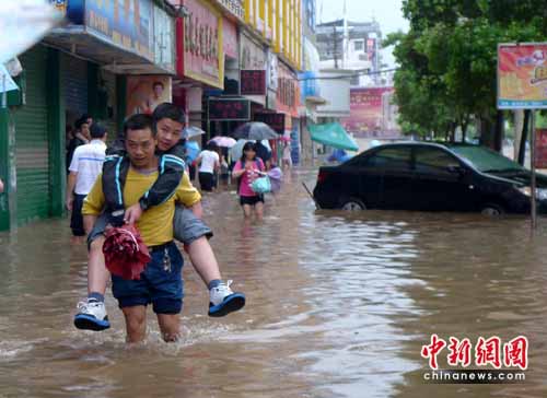 新化縣城從6日凌晨1時(shí)起,暴雨一直持續(xù)下到早上9時(shí)多。上午8時(shí),受暴雨影響,新化縣城區(qū)寬闊的街道已經(jīng)變成了洶涌的河面,走在地勢(shì)較低的街面淹至人大腿。很多市民為了趕著上班,冒險(xiǎn)涉水通過(guò)。一些汽車因?yàn)榘l(fā)動(dòng)機(jī)進(jìn)水,拋錨停在道路上。