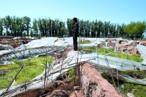昨日8時,位于昌平區(qū)沙河鎮(zhèn)踩河新村的一蔬菜基地,兩百米長的圍墻已變成殘垣斷壁,幾個菜大棚被夷為平地,旁邊竹竿和塑料交錯,油菜被壓扁,菜地上有車輪痕跡。菜農(nóng)介紹,昨日凌晨4時許,14輛鏟車推開圍墻,推倒30畝左右的蔬菜大棚。