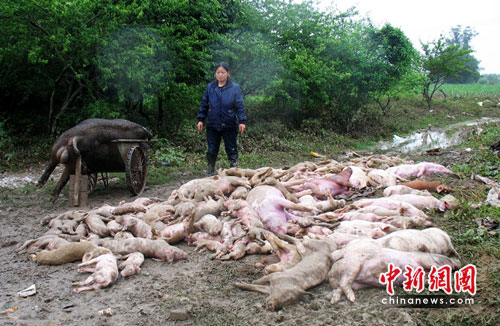 翁源縣官渡養(yǎng)豬場老板林德富告訴記者,6日晚11時(shí)左右,暴雨使得水勢(shì)迅速在整個(gè)養(yǎng)豬場蔓延,造成損失至少1200多頭豬。面對(duì)被洪水沖得一片狼藉的養(yǎng)豬場,這個(gè)56歲的漢子忍不住蹲在地上掩面而泣。