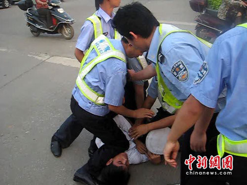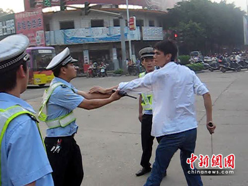 該司機在返回現(xiàn)場接受處理時直接質(zhì)問民警:“現(xiàn)在已經(jīng)是傍晚6點30分了,我的車為什么還不能過?”情緒異常激動的他跟本聽不進執(zhí)勤民警的任何解釋和勸導。隨后,該司機回到貨車駕駛室內(nèi)拿來一把長約一米的大砍刀,徑直來到中山崗紅綠燈路口就想沖上前欲砍民警。