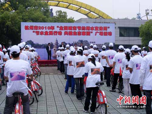 中新網(wǎng)杭州5月15日電(記者 趙曄嬌 實(shí)習(xí)生 徐進(jìn)軍)今天,杭州市“全國城市節(jié)約用水宣傳周”活動在該市少年宮廣場舉行,由近五十名大學(xué)生組成的節(jié)水志愿者車隊(duì)騎著公共自行車環(huán)繞西湖,倡導(dǎo)“節(jié)水減排,綠色出行”,提高市民低碳意識。據(jù)悉,杭州水資源緊缺的矛盾日益嚴(yán)峻,僅去年末總蓄水量就較2008年同期減少10.14億立方米,相當(dāng)于減少近100個(gè)西湖的水量。