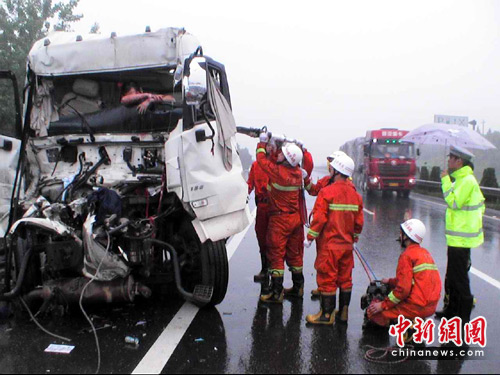 到達(dá)現(xiàn)場后,只見地上滿是兩車撞擊后散落的碎片,一輛車牌號(hào)為陜AA5477的貨車車尾已變形,車牌號(hào)為贛AA1398的追尾石油貨車車頭嚴(yán)重變形,車內(nèi)司機(jī)雙腿被方向盤卡住無法動(dòng)彈,且受傷嚴(yán)重,生命垂危。另有一名婦女被困在后排座位,由于事發(fā)時(shí)婦女正平躺在后座睡覺,所以只被前排座位擠壓,尚有活動(dòng)空間,并無危險(xiǎn)。