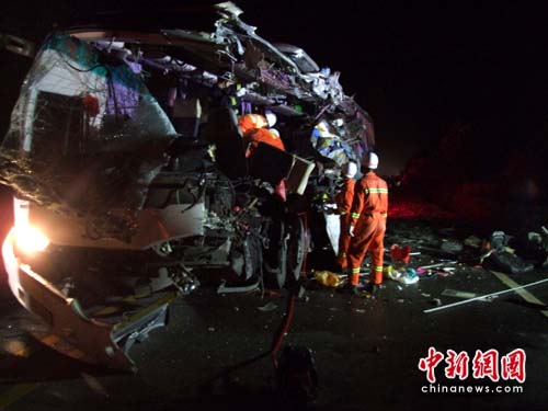 消防官兵現(xiàn)場了解到,事故發(fā)生后兩車上的傷員已在先期到場的民警及現(xiàn)場熱心群眾的幫助下送往醫(yī)院救治,但仍有10人被困于兩車之上,估計全部遇難。為盡可能救助受困人員,消防官兵馬上組織了救援行動,四名官兵爬上變形車體,利用液壓擴(kuò)張器和切割機(jī)切開擠壓在被困者身上的零部件,而后將人員一一抬出?墒且蜍圀w變形扭曲嚴(yán)重,多名遇難人員均是被座位和車輛部件緊緊絞壓,使得救援行動困難重重。