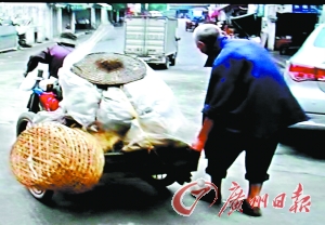 在穿梭的車流中,陳老伯弓著腰,吃力地拉著歪歪扭扭的平板車在大馬路上緩慢前行,車輛在他身邊飛馳而過,老人究竟要去哪里呀?“我要拉去清新縣逕口,要走3個(gè)小時(shí)啊,”從老伯含糊不清的言語中,記者得知,原來這對年齡加起來160歲的老夫妻每天凌晨3時(shí)多就要起身,從20多公里外的城郊拉車徒步進(jìn)城,到了市場已經(jīng)天亮,接著他們分頭去揀一些爛菜葉等裝好車,再一路拉回去喂豬,到了家里已是月上梢頭。一個(gè)8旬老伯拉著平板車從松崗市場去清新逕口,就算是一個(gè)正常人行路,也要走幾個(gè)小時(shí),別說是拉車了。陳伯的舉動(dòng)吸引了不少人的好奇的目光,他為何要這樣折磨自己?