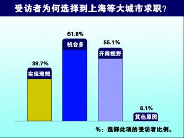針對(duì)目前在上海讀書以及曾經(jīng)在上海讀書的部分人群調(diào)查顯示,有43.2%的受訪者坦言,當(dāng)初到上海求學(xué),就是希望畢業(yè)后留在上海工作或生活; 55.6%的人認(rèn)為學(xué)校教育質(zhì)量好, 22.7%的人以在上海等大城市上學(xué)為榮。