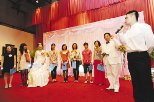 當(dāng)舞臺(tái)背景展開“杰出男生11大優(yōu)點(diǎn)”的投影掛屏?xí)r,主持人問女嘉賓喜不喜歡這些優(yōu)點(diǎn)?她們齊聲道:“喜歡!”主持人說:“這就是站在我們面前的這位帥哥身上所具備的優(yōu)點(diǎn)!边@時(shí),主持人問新郎:“什么是最好的男女組合?”新郎答:“男生智慧,女生賢惠!”“請(qǐng)你選出‘心動(dòng)女生’!”這位新郎臉現(xiàn)真誠(chéng),大步走到舉著“賢惠”寫字板、風(fēng)姿綽約的新娘面前,牽住她的手,兩人一起走向臺(tái)前,對(duì)著來賓大聲說出“愛的誓言”,全場(chǎng)掌聲響起。