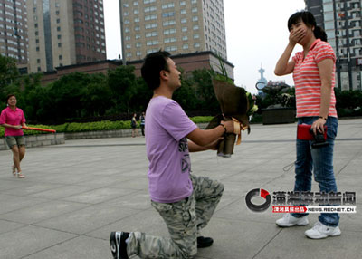 “胡安萱,我好愛好愛你!”70米長的大紅橫幅從象征“幸!钡哪μ燧喩洗瓜拢L沙小伙王樂手捧玫瑰單膝下跪向女友求婚:“老婆,嫁給我吧,我們生個兒子讓他早點(diǎn)過兒童節(jié)!”