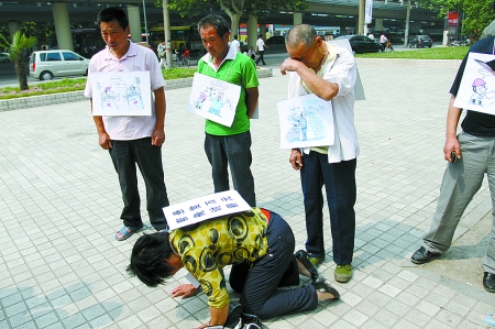 昨日上午9時許,鄭州市紫荊山立交橋附近,河南飯店南門口小廣場上,5名農(nóng)民工頭頂烈日手持訴狀,身上前后掛著兩個大牌子,背面寫著“幫俺討薪,懸賞萬元”,正面是形象生動的漫畫,農(nóng)民工此舉引來不少市民圍觀。