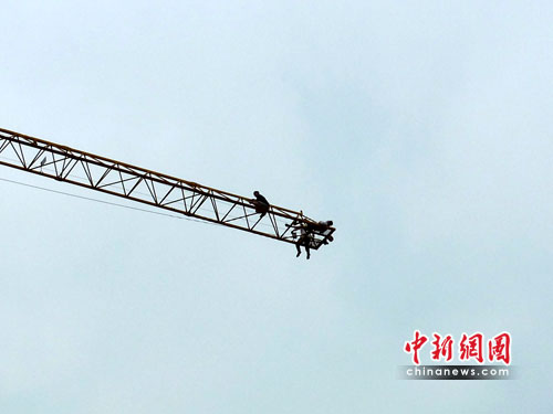 中新網(wǎng)柳州6月3日電(羅海生 黃坤軍)6月3日,廣西柳州市東環(huán)路一在建工地35米高的塔吊頂端,三名農(nóng)民工為了討薪欲跳塔。接警后柳州特勤消防大隊(duì)迅速出動(dòng)一臺(tái)多功能救援車、1臺(tái)53米云梯車,9名官兵趕赴現(xiàn)場(chǎng)救援,經(jīng)過近一個(gè)小時(shí)的勸說三民男子才放棄了輕生的念頭。