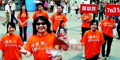 下午3時(shí),春熙路口出現(xiàn)一群身著橘色T恤衫的年輕人,T恤上印有“支持奶茶哥,7·31我在成都等你”等字樣。他們迅速排成一個(gè)“心”形隊(duì)列,手舉紅色的口號(hào)牌大喊:“劉若英,嫁給‘奶茶哥’吧!”“眼尖”的市民立馬就認(rèn)出了站在隊(duì)伍最前面的“莫扎特趙”,就是現(xiàn)在廣為成都市民所熟知的“奶茶哥”!澳滩韪纭贝髦R,身穿橘色T恤、白色休閑褲,手上捧著一大束玫瑰花,看起來心情不錯(cuò)。