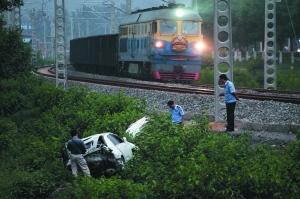 昨日(13日)下午,京承鐵路線順義區(qū)李天路鐵道口,一輛本田轎車闖過道桿,與一列貨運(yùn)列車尾部相撞。轎車內(nèi)母子被救出,此時(shí)一列客運(yùn)列車開來(lái),轎車又被撞出數(shù)十米遠(yuǎn)并跌落在路旁溝內(nèi)。