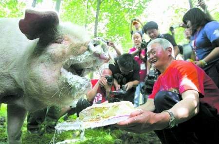 王福清、萬興明和劉大會(huì)只好將蛋糕拿到樹林里去。“豬堅(jiān)強(qiáng)”嗅了嗅從來沒有吃過的蛋糕,張開大嘴吃起來。人們爭相去看,為它拍照,“豬堅(jiān)強(qiáng)”被圍得嚴(yán)嚴(yán)實(shí)實(shí)。王福清還給它臉上抹上了奶油。