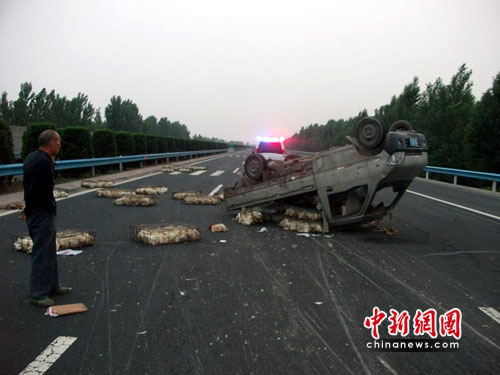 2010年6月22日中午13時(shí)許,炙熱的太陽照得大地只想冒煙,一輛白色小貨車滿載雞子疾馳在京港澳高速公路上。當(dāng)行駛到京港澳高速632公里西半幅時(shí),突然“咚”一聲響,坐在駕駛位上的李某突然感覺車輛傾倒,控制不住疾馳的貨車,車輛側(cè)翻在高速公路上,滿車的雞子撒在路上,到處都是雞毛。河南高速交警總隊(duì)黃河二橋大隊(duì)接到過路司機(jī)的報(bào)警后,迅速趕到事故現(xiàn)場,設(shè)置警戒帶,迅速搶救傷員,所幸駕駛員李某事先行車時(shí)扎緊了安全帶,只是受了皮外傷,在急救人員救出時(shí)依然茫然不知所措。在民警、路政工作人員的共同努力下,迅速清理現(xiàn)場,恢復(fù)路面正常通行。