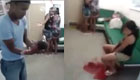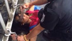 實(shí)拍小學(xué)生腳踩旱冰鞋手拉公交借力滑行