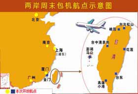航點(diǎn) 大陸方面同意先行開(kāi)放北京、上海(浦東)、廣州、廈門、南京5個(gè)航點(diǎn),并陸續(xù)開(kāi)放成都、重慶、杭州、大連、桂林、深圳,以及其他有市場(chǎng)需求的航點(diǎn)。臺(tái)灣方面同意開(kāi)放桃園、高雄小港、臺(tái)中清泉崗、臺(tái)北松山、澎湖馬公、花蓮、金門、臺(tái)東等8個(gè)航點(diǎn)。