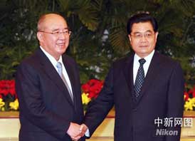2005年4月29日,胡錦濤與連戰(zhàn)在北京會談,發(fā)布兩岸和平發(fā)展共同愿景。