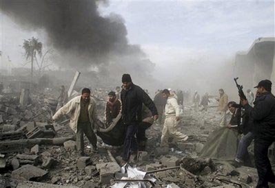 第六日 哈馬斯領導人尼扎爾•拉揚的住所遭到以軍轟炸,他本人及多名家人喪生。這是以軍空襲加沙以來首次炸死哈馬斯高級領導人?偹劳鋈藬(shù)則上升至410人,2000多人受傷。當天,以色列國防部公布了“鑄鉛行動”的最新戰(zhàn)報,稱已摧毀了哈馬斯位于加沙的450處據(jù)點,有25處是在新年第一天的襲擊中擊毀的。另外,聯(lián)合國安理會召開會議,就呼吁加沙地帶實現(xiàn);鸬臎Q議草案進行討論,但因英美反對而未獲通過。【詳細】