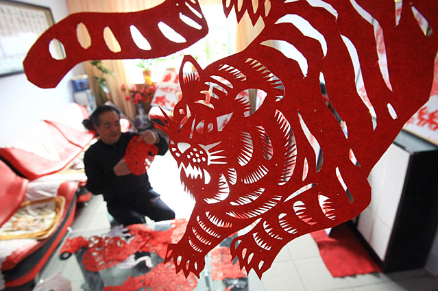圖:河南農(nóng)民手撕“虎”字迎新春