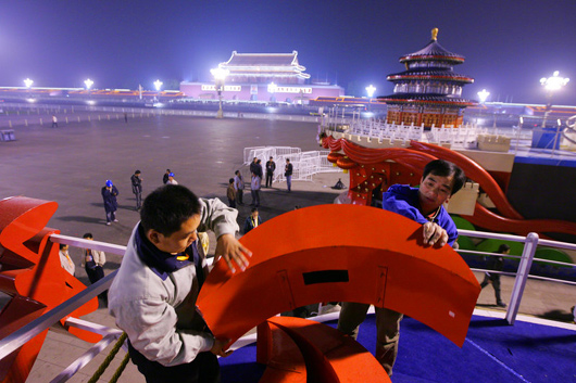 圖:張藝謀指導(dǎo)工作人員安裝網(wǎng)幕煙花