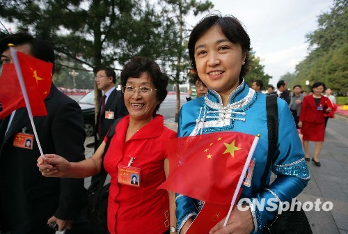 圖:少數(shù)民族代表手持五星紅旗步入慶典現(xiàn)場(chǎng)