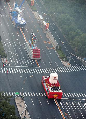 圖:國(guó)慶游行彩車向長(zhǎng)安街指定地點(diǎn)集結(jié)