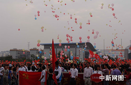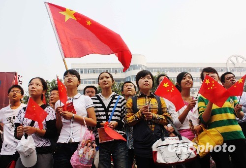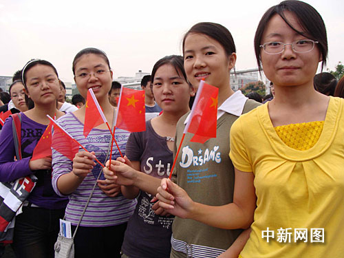 圖:黑龍江大學(xué)生揮舞國(guó)旗為祖國(guó)歡呼