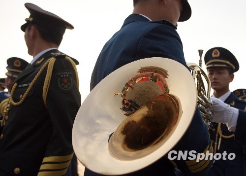 圖:國(guó)慶盛典前軍樂隊(duì)號(hào)手認(rèn)真準(zhǔn)備