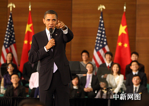 圖:美國總統(tǒng)奧巴馬在上海與中國青年對話