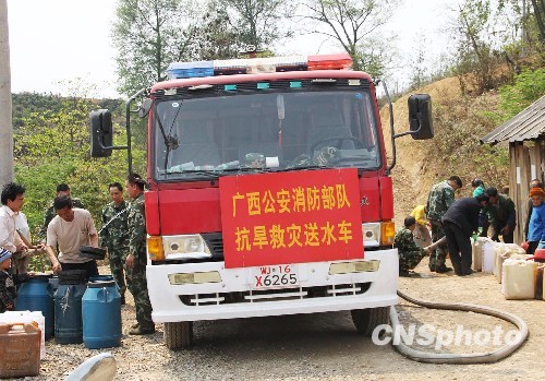 圖:廣西消防部隊(duì)為旱區(qū)居民送水