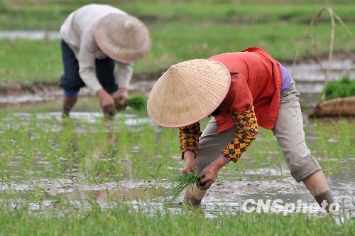 圖:廣西欽州農(nóng)民搶插早稻