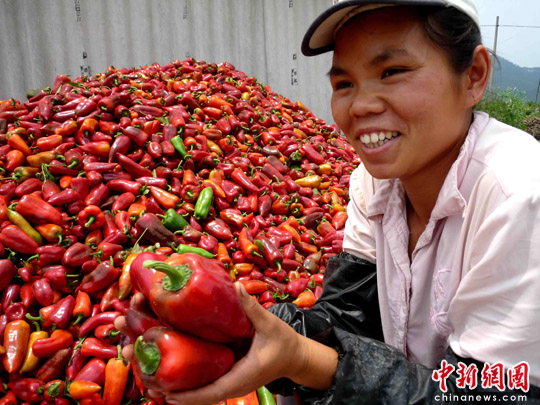 圖:雨后廣西旱區(qū)農(nóng)民搶收菜椒上市