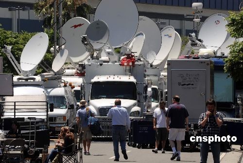 追悼會(huì)臨近 媒體衛(wèi)星轉(zhuǎn)播車聚集現(xiàn)場(chǎng)