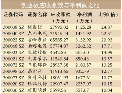 同花順資訊統(tǒng)計(jì)顯示,創(chuàng)業(yè)板公司應(yīng)收賬款竟是凈利潤20倍以上的公司有3家,其中梅泰諾(300038)的應(yīng)收賬款竟是凈利潤的24.87倍,位居榜首;九洲電氣(300040)的應(yīng)收賬款竟是凈利潤的22倍,位居第二。應(yīng)收賬款與凈利潤之比大于10倍的有11家。創(chuàng)業(yè)板中,應(yīng)收賬款最低的是三五互聯(lián)(300051.SZ),其中報(bào)凈利潤為1694.27萬元,而應(yīng)收賬款僅為157.97萬元。
