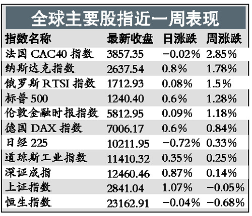雖然中國A股近期萎靡不振,但其他多數(shù)股指表現(xiàn)搶眼,其中,受利好數(shù)據(jù)提振,美國道瓊斯指數(shù)上周五報收11410.32點(diǎn),上漲0.35%,且已經(jīng)實現(xiàn)連續(xù)兩周走高。其中,納斯達(dá)克收盤創(chuàng)下2007年12月以來的新高。而法國股市更是以2.85%的單周漲幅領(lǐng)漲全球股市。
