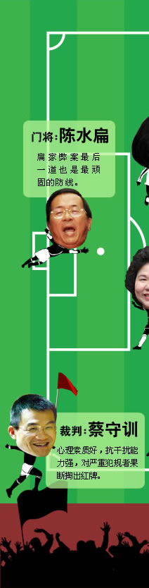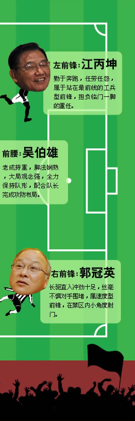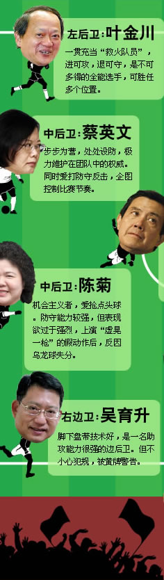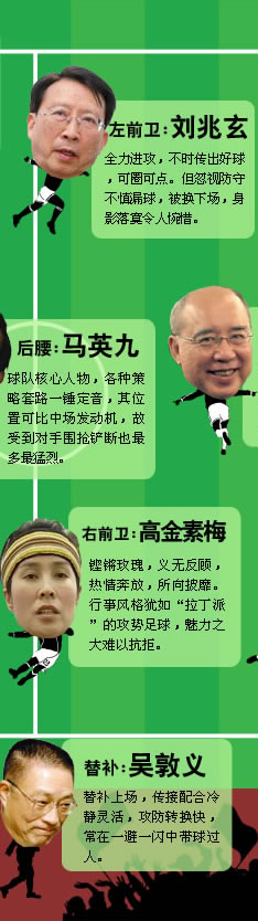 2009年大幕即將落下,臺(tái)灣政壇照舊精彩紛呈,多路人馬粉墨登場。在這個(gè)情節(jié)跌宕起伏、堪比“足球甲級(jí)聯(lián)賽”的舞臺(tái)上,眾“球員”充分展示出個(gè)人技術(shù)和力量。中新網(wǎng)特別從各支“參賽隊(duì)伍”中精挑細(xì)選,組成“本年度全明星陣容”,藉此梳理臺(tái)灣政壇發(fā)生的那些人和事,以饗諸位“球迷”。