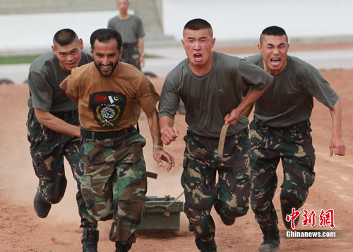7月4日,參加“友誼—2010”中國巴基斯坦反恐聯(lián)合訓(xùn)練的兩軍士兵進(jìn)行體能訓(xùn)練。此次訓(xùn)練在中國寧夏青銅峽地區(qū)展開,主要以邊境地區(qū)山地聯(lián)合反恐作戰(zhàn)為課題,分為展示交流、混編同訓(xùn)、綜合演練三個階段。這是兩國之間舉行的第三次反恐聯(lián)合訓(xùn)練。中新社發(fā) 杜洋 攝