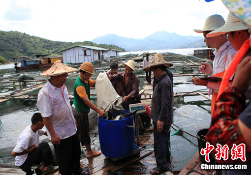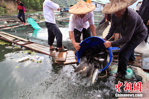 自7月8日起,福建永定縣棉花灘庫區(qū)因受上杭紫金山銅礦濕法場廢水外滲出現(xiàn)大量死魚現(xiàn)象后,永定縣政府采取措施,派出工作組分赴各網(wǎng)箱養(yǎng)殖場統(tǒng)一收購受污染的魚。對(duì)于死魚和難以存活的魚,進(jìn)行無害化集中填埋,并制訂“網(wǎng)箱上岸、破網(wǎng)入庫”等有效措施,對(duì)網(wǎng)箱里存活的魚,同樣按綜合價(jià)每斤6元進(jìn)行統(tǒng)一收購,并及時(shí)放入大庫。盧基瑩 賴初源/攝