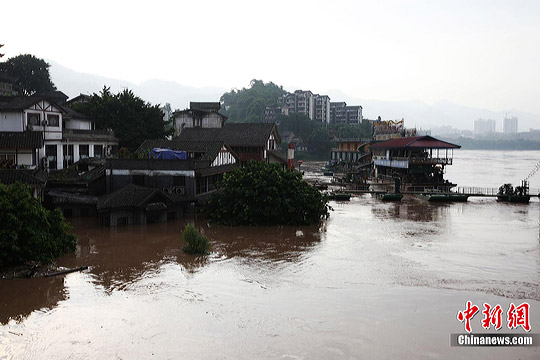 7月19日,今年入汛以來(lái)最大洪峰經(jīng)過(guò)重慶主城,長(zhǎng)江、嘉陵江水位上漲。記者在重慶古鎮(zhèn)磁器口看到,從磁器口江邊至磁器口街道的梯坎已“隱”于水面下,標(biāo)志性牌匾龍隱門(mén)沒(méi)至“腰部”,靠近江邊的商鋪及民居被淹。目前,大部分商家、市民接預(yù)警已提前撤場(chǎng)歇業(yè)或撤離至安全地帶。截至記者趕赴磁器口途中,部分必經(jīng)路段已實(shí)施交通管制,磁器口正街漲水期間亦采取禁行措施。據(jù)長(zhǎng)江水利委員會(huì)水文局監(jiān)測(cè)數(shù)據(jù),19日20時(shí)長(zhǎng)江重慶寸灘站水位超過(guò)185米,這是重慶遭遇的長(zhǎng)江今年以來(lái)最大洪峰。截至20日0時(shí),長(zhǎng)江重慶水位仍在185.06米的峰值上流動(dòng),洪峰仍在過(guò)境重慶。 劉函冉 攝