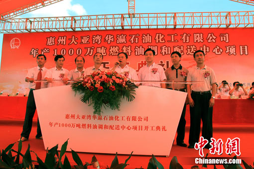總投資53.9億元人民幣,設(shè)計(jì)年生產(chǎn)能力達(dá)1000萬噸的廣東惠州大亞灣華瀛石油化工有限公司燃料油調(diào)和配送中心項(xiàng)目9日正式動工建設(shè)。該項(xiàng)目是廣東省重點(diǎn)項(xiàng)目,建成投產(chǎn)后或?qū)⒊蔀橹袊畲笕剂嫌驼{(diào)和配送中心。 圖為惠州市委書記黃業(yè)斌宣布惠州大亞灣華瀛石油化工有限公司燃料油調(diào)和配送中心項(xiàng)目開工?敌⒕ 攝