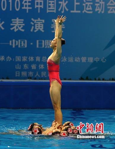 8月30日晚,2010中國(guó)水運(yùn)會(huì)惟一個(gè)表演項(xiàng)目——花樣游泳在山東日照市游泳館跳水館結(jié)束。連續(xù)兩晚的表演引爆了日照游泳館,場(chǎng)館內(nèi)座無(wú)虛席,隊(duì)員們的表演博得了現(xiàn)場(chǎng)觀眾的陣陣掌聲。圖為花樣游泳表演的精彩瞬間。