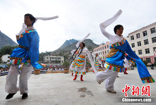 9月30日,甘肅舟曲縣第三初級中學(xué)舉行迎國慶61周年文藝匯演,祝福祖國更加強盛。今年8月8日,舟曲遭遇特大山洪泥石流地質(zhì)災(zāi)害,經(jīng)過1月多的搶險救災(zāi)工作,舟曲救災(zāi)工作已步入轉(zhuǎn)型,如今的縣城,多數(shù)商戶恢復(fù)營業(yè),學(xué)校恢復(fù)教學(xué)秩序。