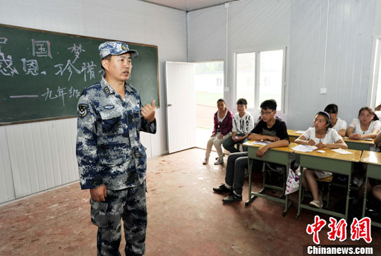 5月14日,在四川蘆山地震震中龍門(mén)鄉(xiāng)的晨陽(yáng)希望學(xué)校九年級(jí)二班的板房教室里,舉辦了一次特殊的班會(huì)。安源 攝