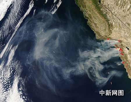 中新網(wǎng)聖地牙哥十月二十四日電(記者 賈國榮)美國宇航局十月二十四日公布的最新衛(wèi)星照片顯示:美國加州火災(zāi)第四天隨風(fēng)勢(shì)趨弱而減少到十二處,但濃厚的煙塵已經(jīng)在太平洋上影響成云層,后果難料。
