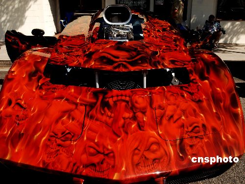 美國洛杉磯十月底萬圣節(jié)前夕,街頭展示獨(dú)一無二的紅色魔鬼跑車。中新社發(fā) 賈國榮 攝