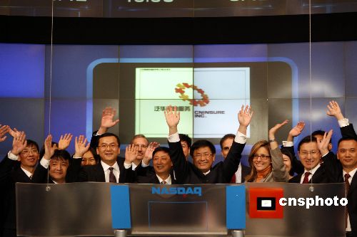 中國大陸首只保險中介股--泛華保險集團三十一日在美國納斯達克證券交易所成功上市。該公司恰好是在納斯達克上市的第五十家中國公司,也是今年在美國上市的所有中國公司當中上市當天表現(xiàn)最好的公司之一。圖為公司董事長胡義南在納斯達克出席開市敲鐘儀式。中新社發(fā) 李靜 攝