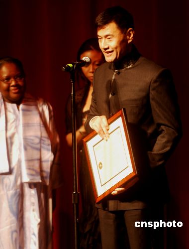 中美電影節(jié)十一月一日晚在好萊塢美國導(dǎo)演公會開幕,聯(lián)合國兒童機(jī)構(gòu)一個協(xié)會特意向中國影星于榮光頒發(fā)和平發(fā)展親善大使證書。中新社發(fā) 賈國榮 攝