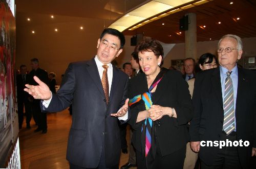 11月7日晚,由中國駐法使館和法國奧委會共同主辦的“北京歡迎您”迎奧運圖片展,在巴黎法國奧委會總部、法蘭西運動之家隆重開幕。旅法華人社團(tuán)僑領(lǐng)等各界人士約400人出席了開幕儀式。圖為中國駐法大使趙進(jìn)軍和法國衛(wèi)生、青年與體育部長巴舍洛-納爾坎女士,法國奧委會主席塞朗杜爾參觀圖片展。中新社發(fā) 鐘誠 攝