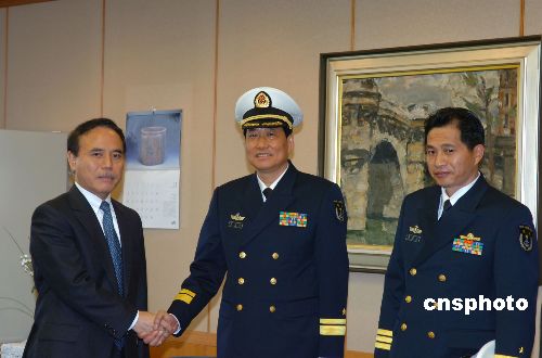 11月29日上午,正在日本進行正式友好訪問的中國海軍軍艦訪日團指揮員肖新年少將一行來到日本防務省,與日本軍界進行交流活動。圖為肖新年少將(中)與日本防務省遷優(yōu)參事官(左)握手,訪日中國海軍導彈驅逐艦“深圳號”艦長朱建達上校(右)陪同會見。中新社發(fā) 滕劍峰 攝
