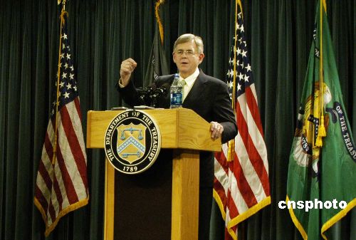 美國財政部12月7日舉行記者會,該部中國事務特使霍爾默(Alan Holmer)在記者會上透露,下周美國財長保爾森將率團前往北京出席第三次中美戰(zhàn)略經(jīng)濟對話,美方代表團成員包括商務部長古鐵雷斯、衛(wèi)生與公共服務部長萊維特、貿(mào)易代表施瓦布、環(huán)保署長約翰遜、代理農(nóng)業(yè)部長康納等高級官員。中新社發(fā) 邱江波 攝