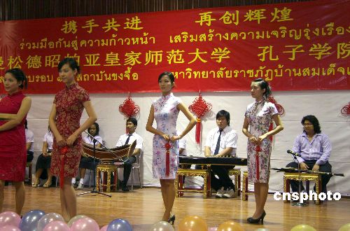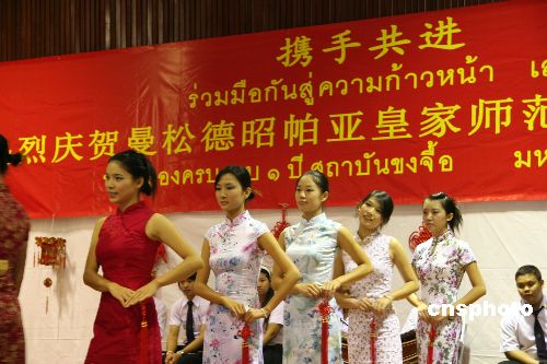 泰國曼松德昭帕亞皇家?guī)煼洞髮W(xué)孔子學(xué)院十九日在該校隆重舉行孔子學(xué)院成立周年慶典活動,慶典儀式后泰中兩國學(xué)生以“多元文化的融合,和諧世界的構(gòu)建”為主題共同表演了一場精彩的文藝演出,圖為泰中兩國學(xué)生的旗袍服裝表演。中新社發(fā) 顧時宏 攝